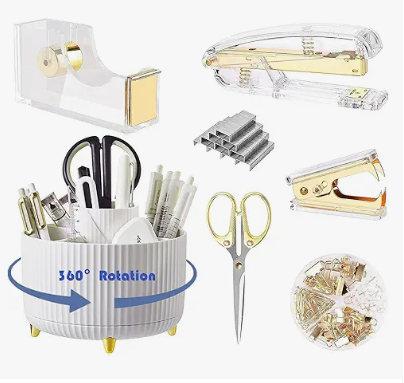 Desk Organizers and Accessories Set with 360-Degree Rotating Pen Holder, Acrylic Stapler, Tape Holder, Staple Remover, Binder/Paper Clips Kit, Scissor and 1 Box of Staples